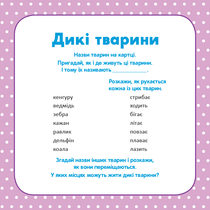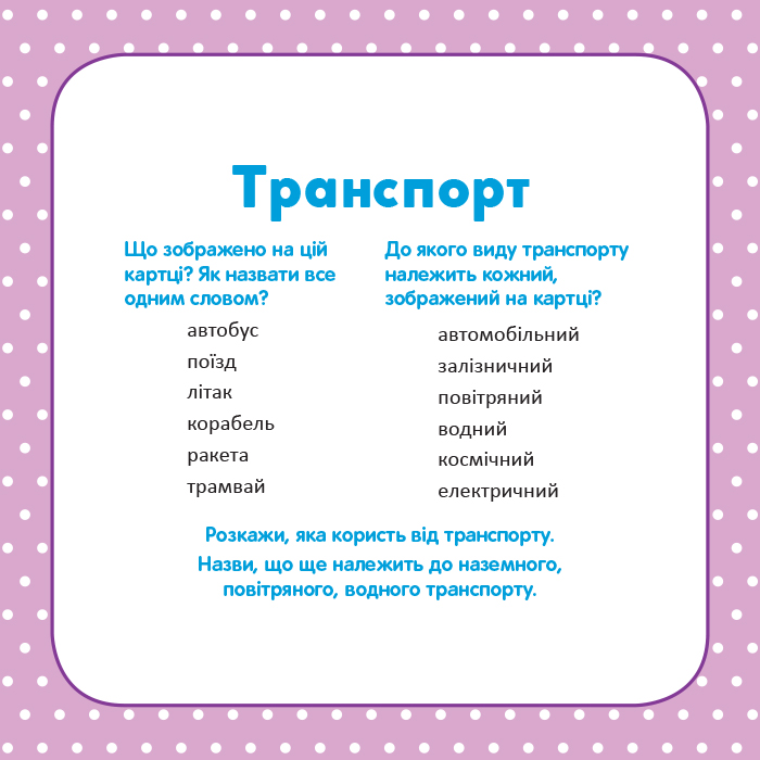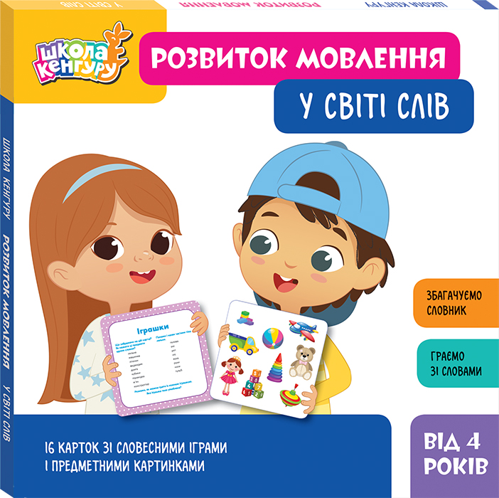 .Набір «Школа Кенгуру. Розвиток мовлення. У світі слів» містить 16 карток, на яких з одного боку — добірка предметних картинок за темами, а з іншого – різноманітні словесні ігри до них. Граючи, дитина навчається добирати узагальнювальні слова, визначати характерні ознаки і властивості предметів, вживати слова у множині тощо. Усе це сприяє активізації і збагаченню словникового запасу. Набір можна використовувати, навчаючи дітей з особливими освітніми потребами.