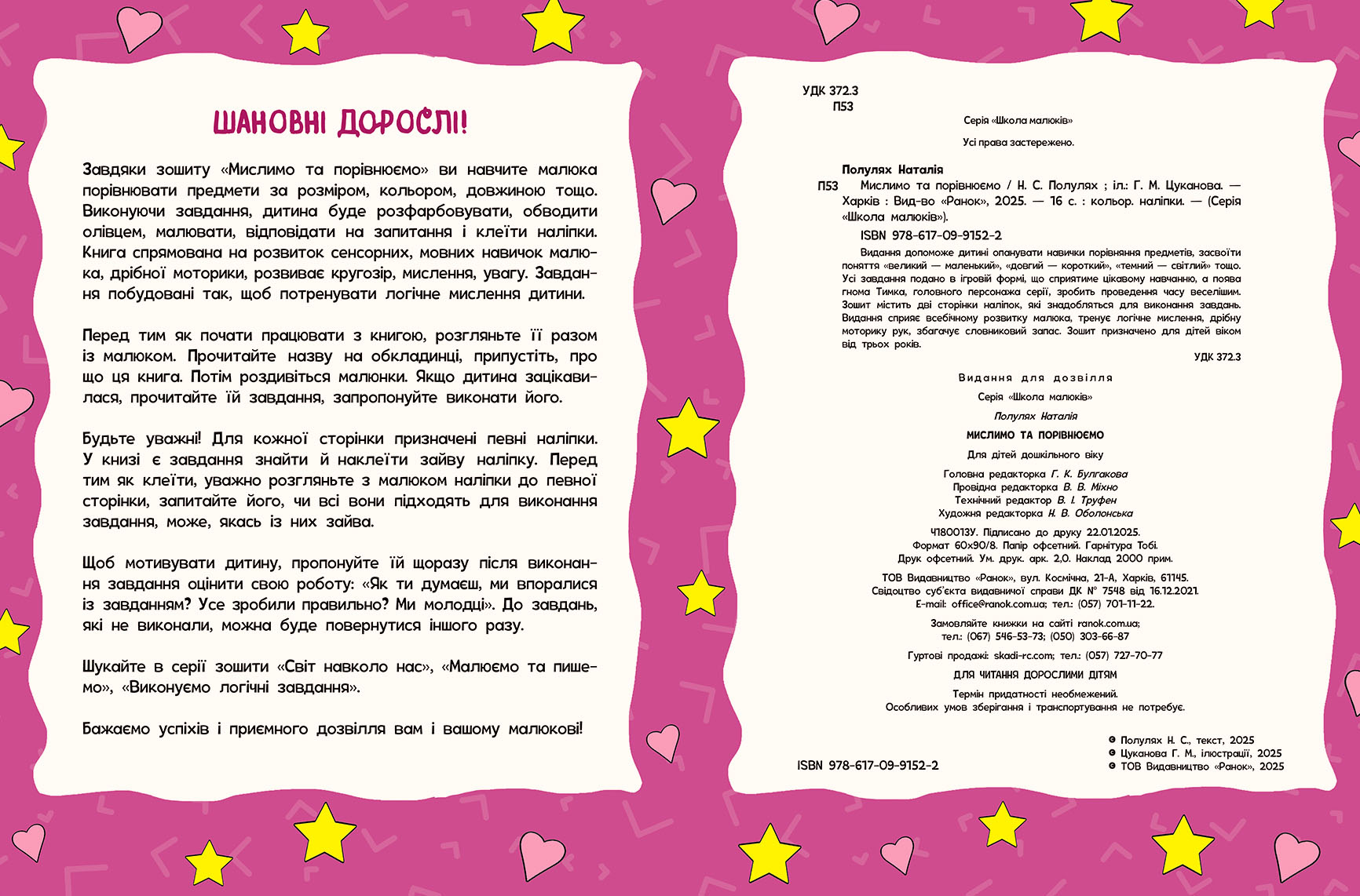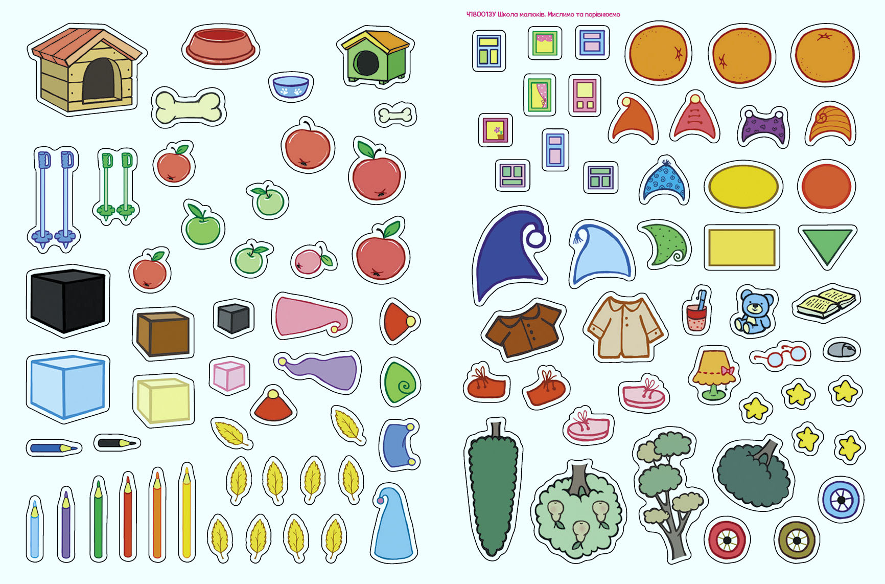 Видання допоможе дитині опанувати навички порівняння предметів, засвоїти поняття «великий — маленький», «довгий — короткий», «темний — світлий» тощо. Усі завдання подано в ігровій формі, що сприятиме цікавому навчанню, а поява гнома Тимка, головного персонажа серії, зробить проведення часу веселішим. Зошит містить дві сторінки наліпок, які знадобляться для виконання завдань.