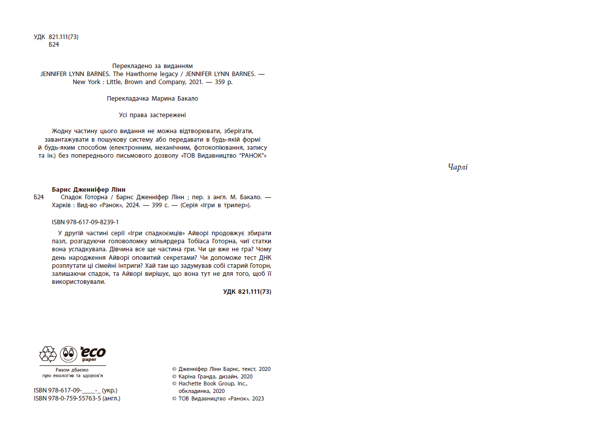 У другій частині серії «Ігри спадкоємців» Айворі продовжує збирати пазл, розгадуючи головомку мільярдера Тобіаса Готорна, чиї статки вона успадкувала. Дівчина все ще частина гри. Чи це вже не гра? Чому день народження Айворі оповитий секретами? Чи допоможе тест ДНК розплутати ці сімейні інтриги? Хай там що задумував собі старий Готорн, залишаючи спадок, та Айворі вирішує, що вона тут не для того, щоб її використовували.
