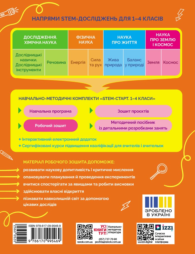 Зошит є складовою навчально-методичного комплекту «STEM-старт». Посібник розроблено з метою формування в учнівства базових дослідницьких навичок і поглиблення знань про фізичні явища, зокрема енергію, її джерела та перетворення. Учні й учениці дослідять світлову енергію, спостерігатимуть за утворенням тіней, аналізуватимуть відбиття світла, вивчать прозорі й непрозорі об’єкти, а також ознайомляться з тепловою енергією, шляхами ї ї передачі та роллю в повсякденному житті.