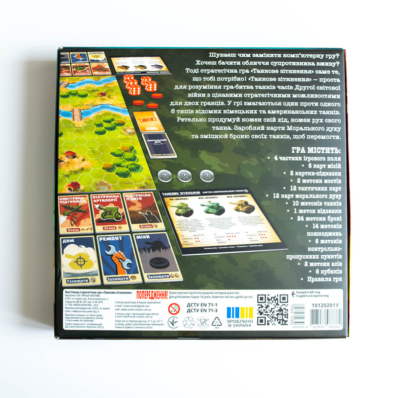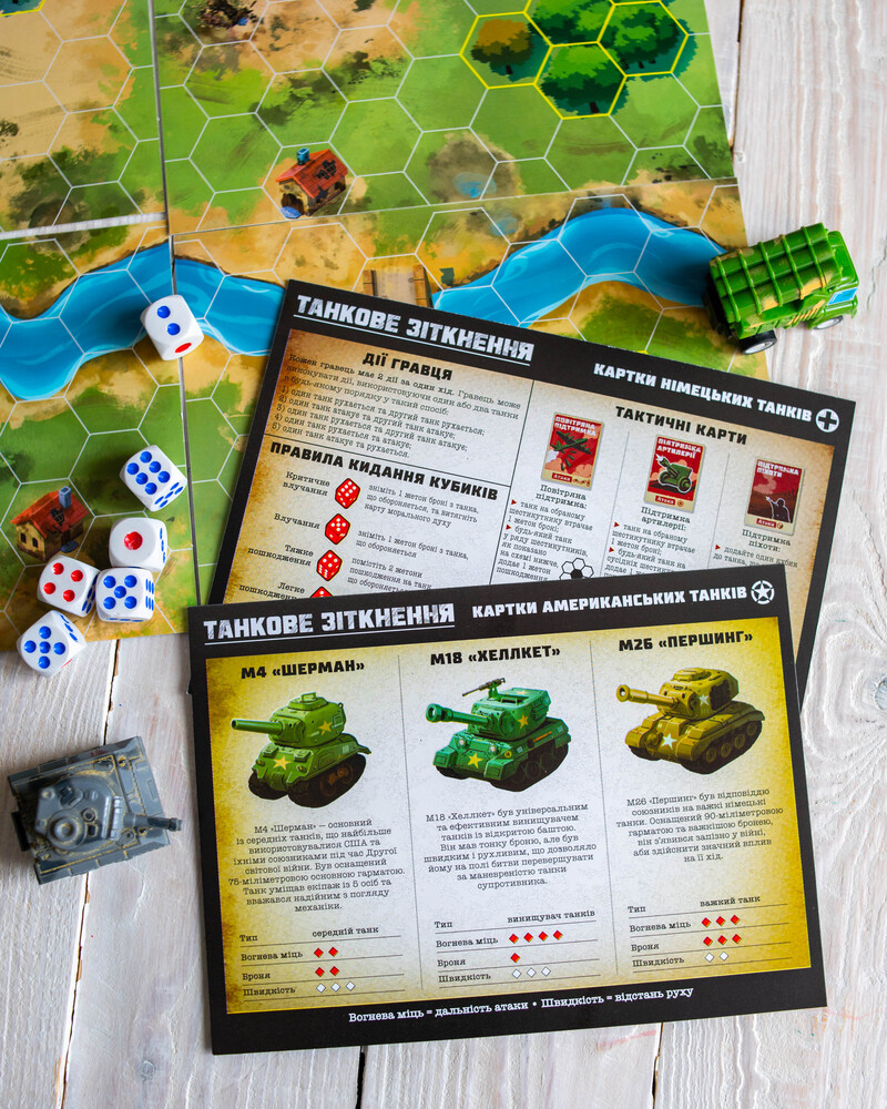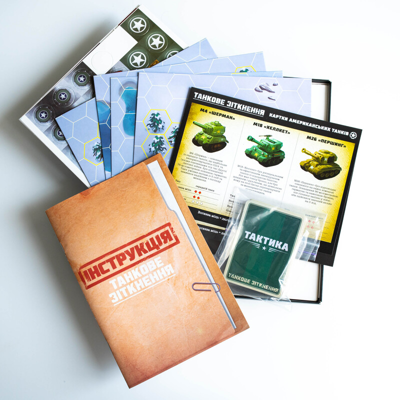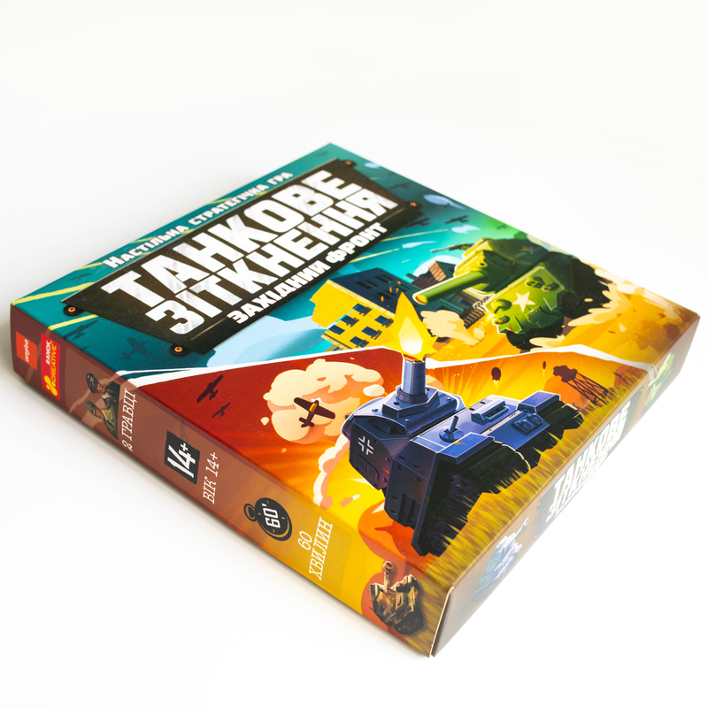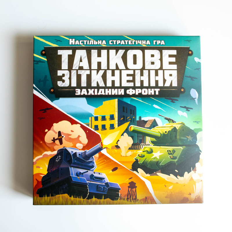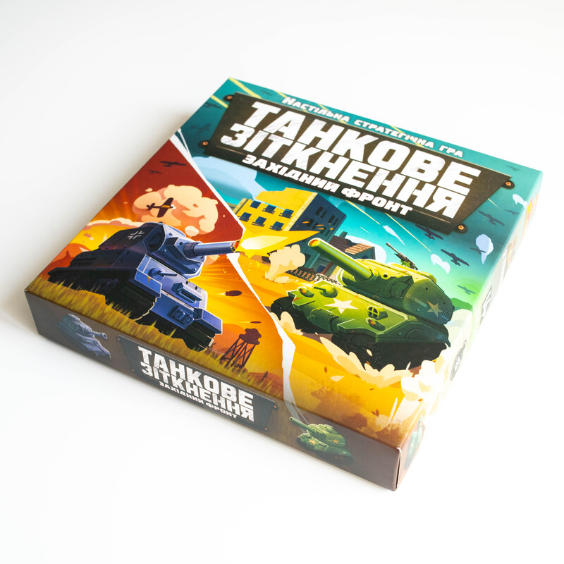 Настільна стратегічна гра «Танкове зіткнення. Західний фронт» — це справжній виклик для тих, хто втомився від екранів і хоче бачити суперника наживо. Втомився від компʼютерних стратегій? Обирай реальну тактичну боротьбу! Гра створена для двох гравців і перенесе вас у світ танкових баталій часів Другої світової війни. У бою зійдуться 6 типів легендарних американських і німецьких танків.