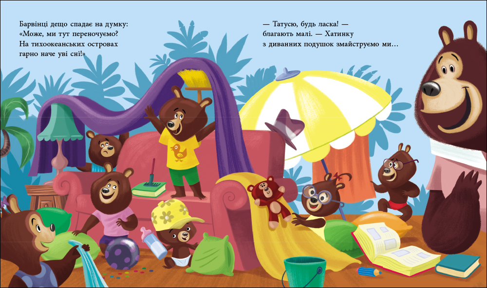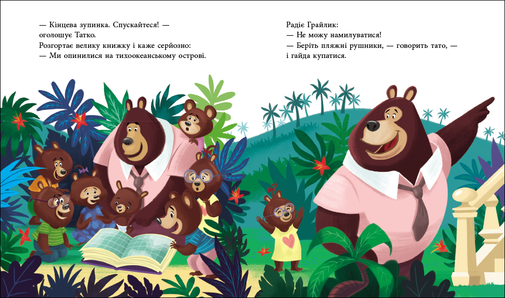 Тато-ведмідь дуже втомився за день і вже саме час відпочити… А, може, влаштувати канікули? Бешкетникам-ведмежатам до вподоби така чудова ідея. Усі разом вони опиняються на тихоокеанському острові, де купаються, ласують морозивом і милуються зорепадом. Що ж за бажання загадає татусь Цілуйко? Як же непросто бути татом, але це таке щастя!