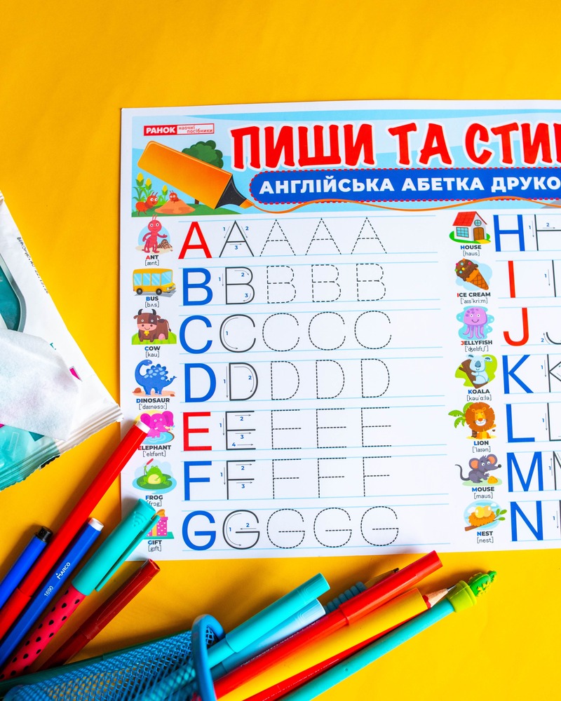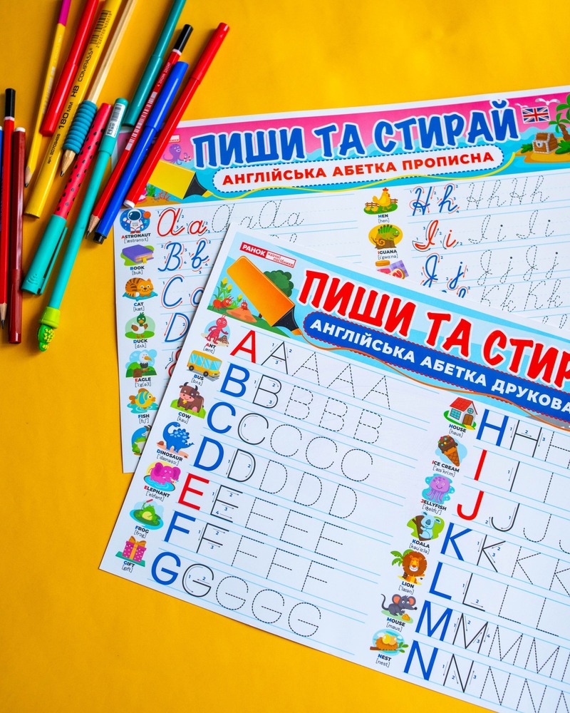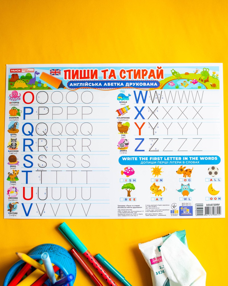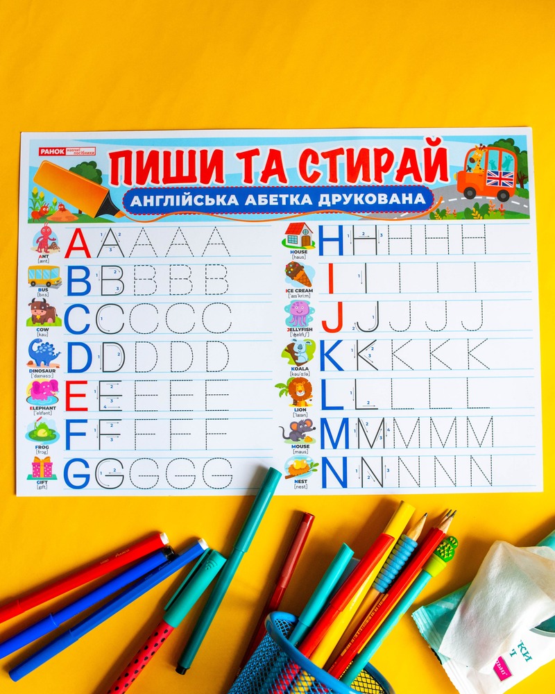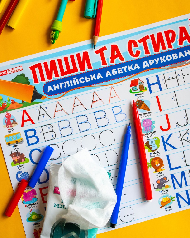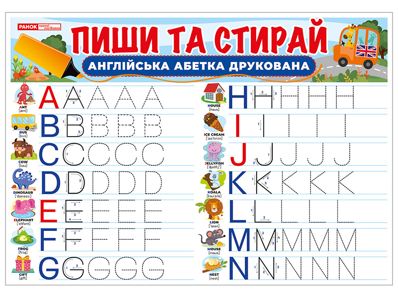 Двосторонній килимок-планшет «Пиши-стирай» – Друковані англійські літери допоможе дітям швидко освоїти написання англійських букв у цікавій та зручній формі.• Багаторазове використання – спеціальне глянцеве покриття дозволяє писати та легко стирати написи вологою серветкою.