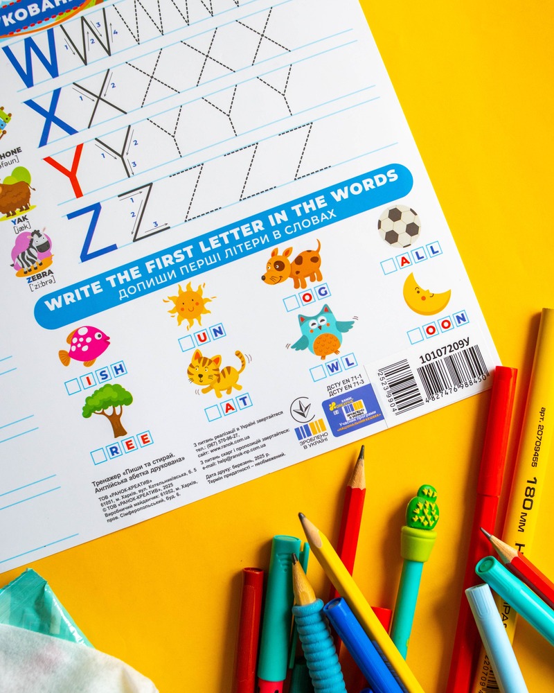 • Зручний формат – ідеально підходить для занять удома, у школі чи дитячому садку. • Практичні завдання – окрім зразків літер, на звороті є 8 вправ для закріплення навичок. Такий тренажер стане чудовим помічником для дошкільнят і учнів молодших класів