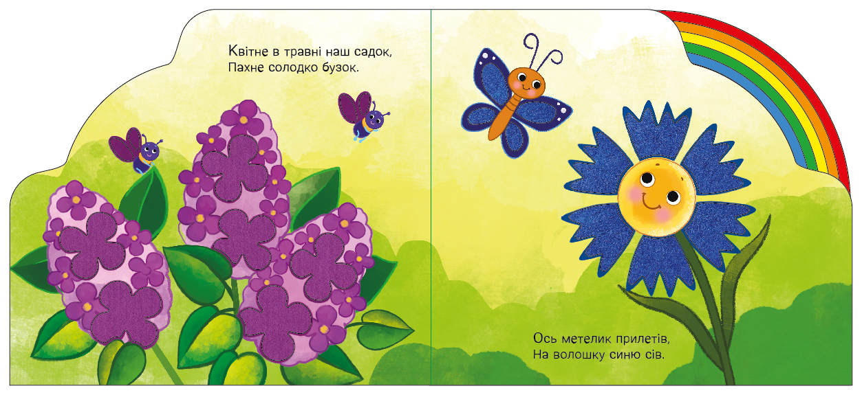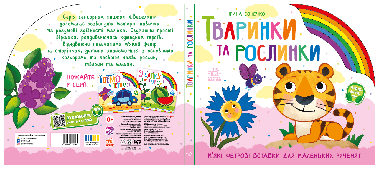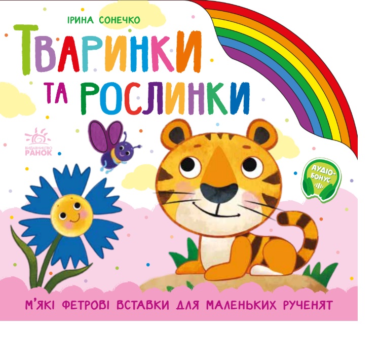 Яскраві малюнки, прості віршики та кумедні персонажі познайомлять вашого малюка з основними кольорами, деякими рослинками та тваринками, а різнокольорові фетрові вставки допоможуть розвинути моторні навички.