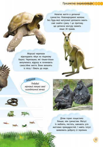 Книга «Тваринний світ» у зрозумілій і захопливій формі познайомить юного читача з дивовижним світом тварин. Із допомогою енциклопедії та уяви школярик зможе дослідити рідну планету та дізнатися багато нового про життя істот, які живуть поряд із нами. На кожному розвороті на дитину чекають цікаві факти, завдання або запитання й дивовижні ілюстрації.