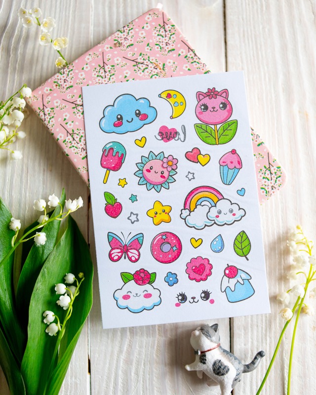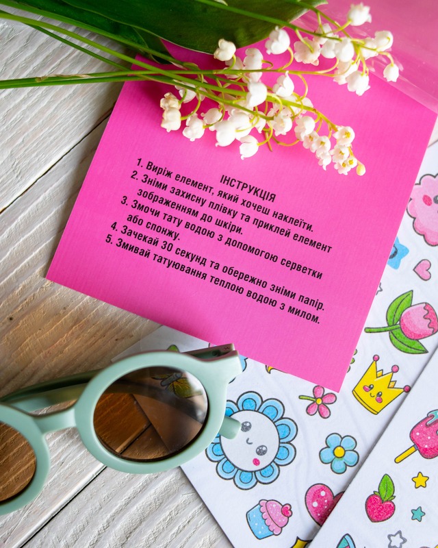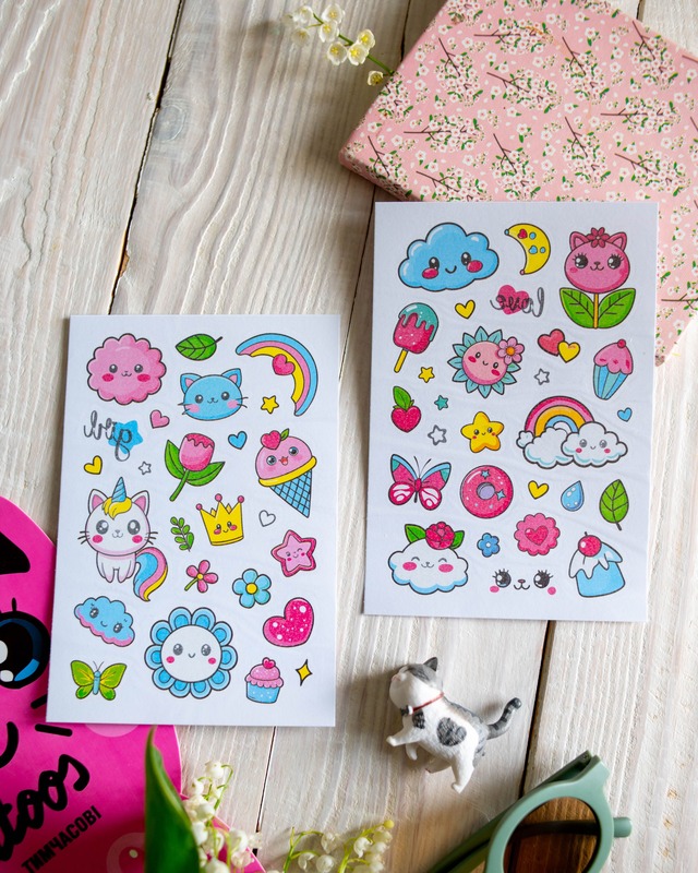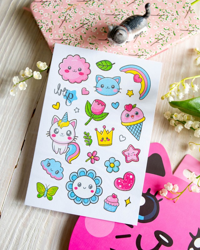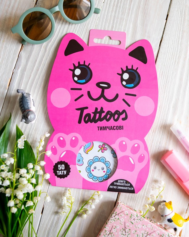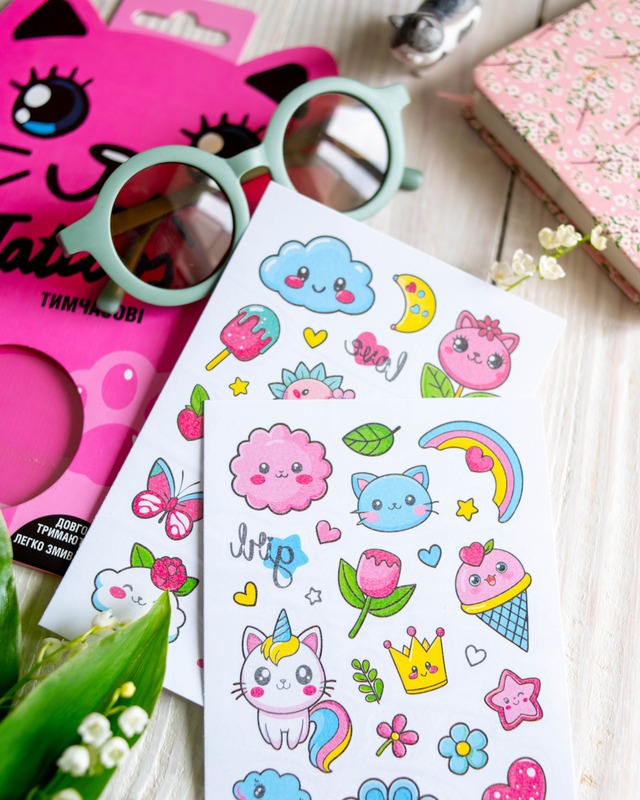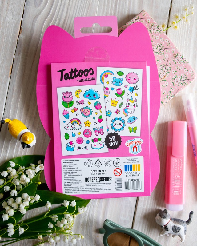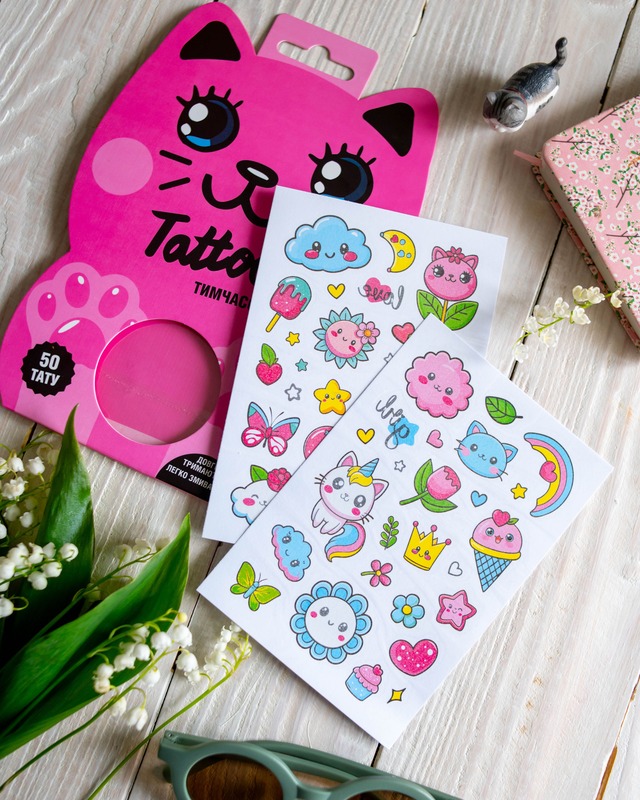 Тимчасові тату для дівчаток віком від 3 років! Милий набір з 50 барвистих татушок у пакуванні-котику. Веселки, хмаринки, метелики, тістечка, єдиноріжки й інші улюблені дитячі сюжети. Легко наносяться водою, довго тримаються, легко змиваються. Безпечні для ніжної дитячої шкіри. Ідеально для маленьких модниць! Рекомендуємо для творчих ігор, вечірок, подарунків або просто для гарного настрою.