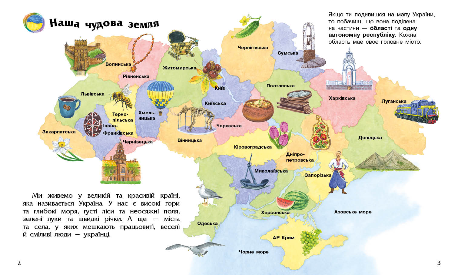 Гадаєте, що вашому синові чи донечці ще зарано знайомитися з енциклопедіями? Якщо малюкові вже є два роки — саме час! Роздивляйтеся разом малюнки, читайте тексти та дізнавайтеся нове про нашу чудову землю, її природу та багатства, українські символи та національні традиції. Книга допоможе маленькому любомудрикові познайомитися ближче з його рідною Батьківщиною, запам’ятати нові слова, вивчити короткі віршики.