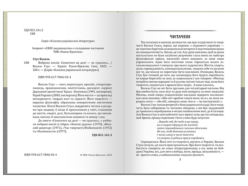 Книга «Василь Стус. Вибрана поезія. Сховатися од долі — не судилось» — стильне подарункове видання творів одного з найвизначніших українських поетів і Героя України. У збірці представлено вірші з найвідоміших творів: «Зимові дерева», «Веселий цвинтар», «Час творчості» та «Палімпсести». Компактний формат 120×166 мм, тверда обкладинка з тисненням, конгревом та матовою ламінацією, 320 сторінок. Ідеальний подарунок для учнів, студентів, викладачів і поціновувачів української літератури.