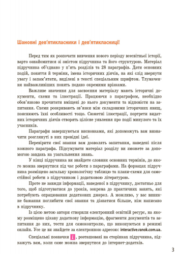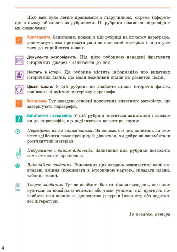 Підручник містить обов’язковий обсяг навчального матеріалу, усі необхідні теоретичні відомості й поняття. До методичного апарату входять фрагменти історичних джерел та запитання до них, додаткова інформація, а також різнорівневі завдання та запитання на осмислення й закріплення вивченого матеріалу. Схеми та ілюстрації підручника допоможуть краще засвоїти основні факти й поняття курсу.