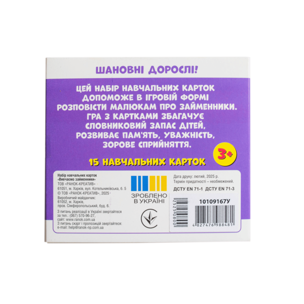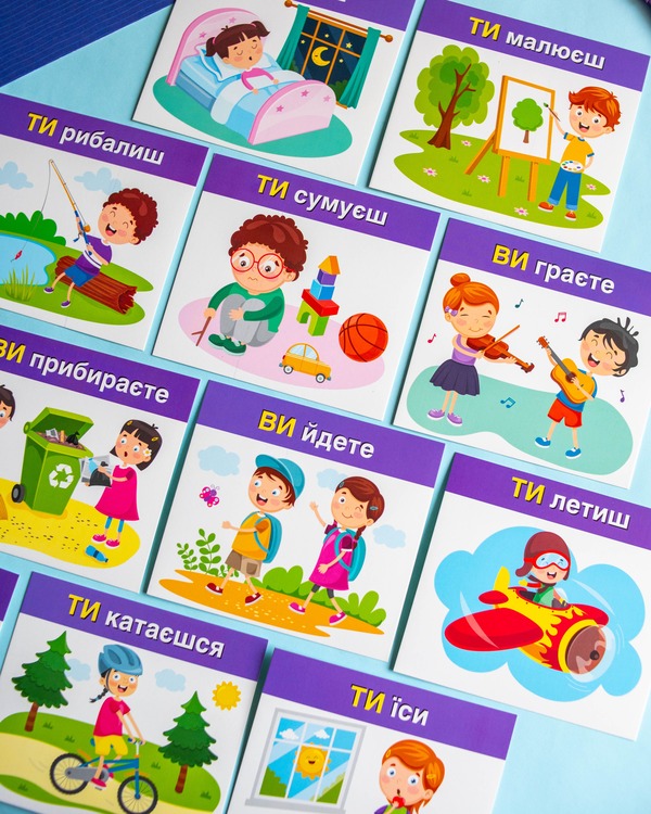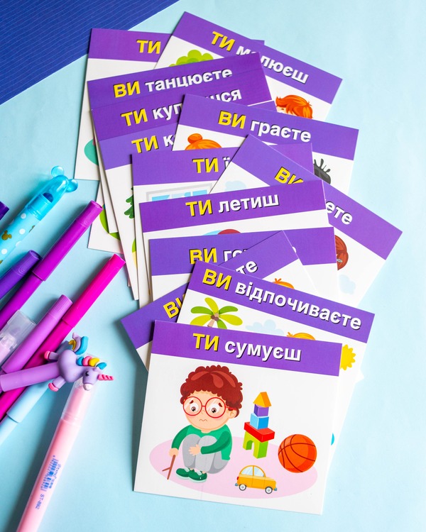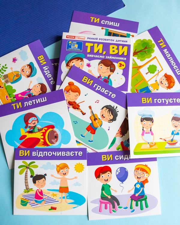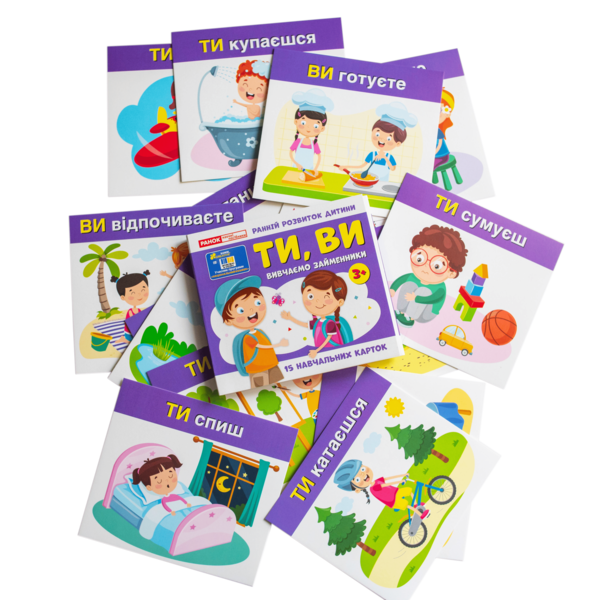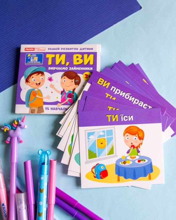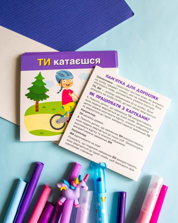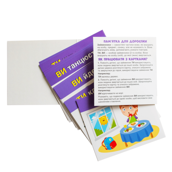Набір допомагає засвоїти вживання займенників «ТИ» та «ВИ» у повсякденному мовленні. Картки розвивають мовлення, пам’ять, увагу, зорове сприйняття та збагачують словниковий запас. Ігровий формат сприяє кращому засвоєнню: дитина взаємодіє з персонажами й навчається через асоціації.