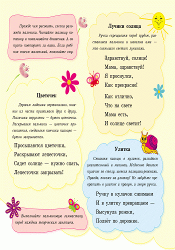 С помощью предложенных книг ваш малыш будет раскрашивать пальчиками веселые картинки и: – тренировать мелкую моторику и координацию движений; – Знакомится с цветами; – Формировать творческое мышление; – Развивать тактильные ощущения. На помощь мамам и папам в каждой книге: – советы по проведению занятий с ребенком; – Полезные пальчиковые упражнения; – Веселые стишки к каждой картинке-раскраски; – Подсказки с раскрашивание картинок.